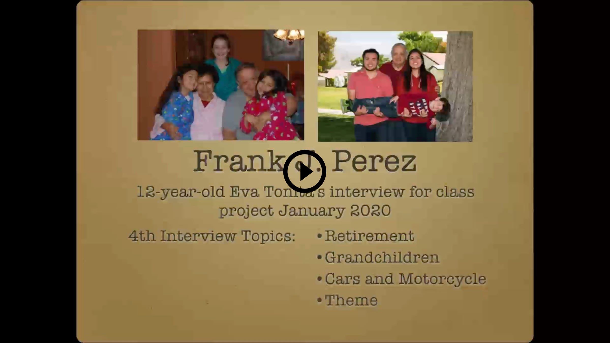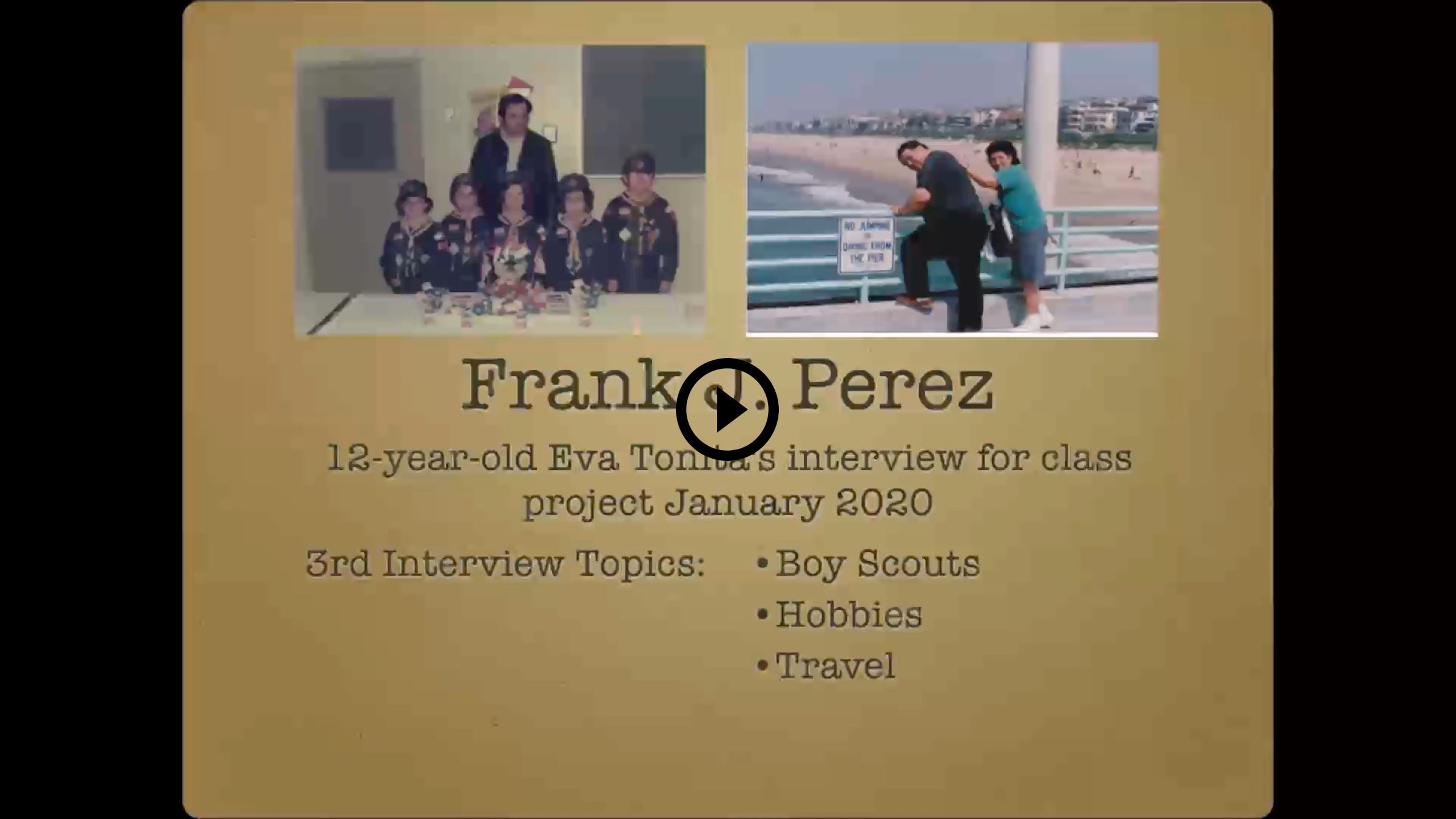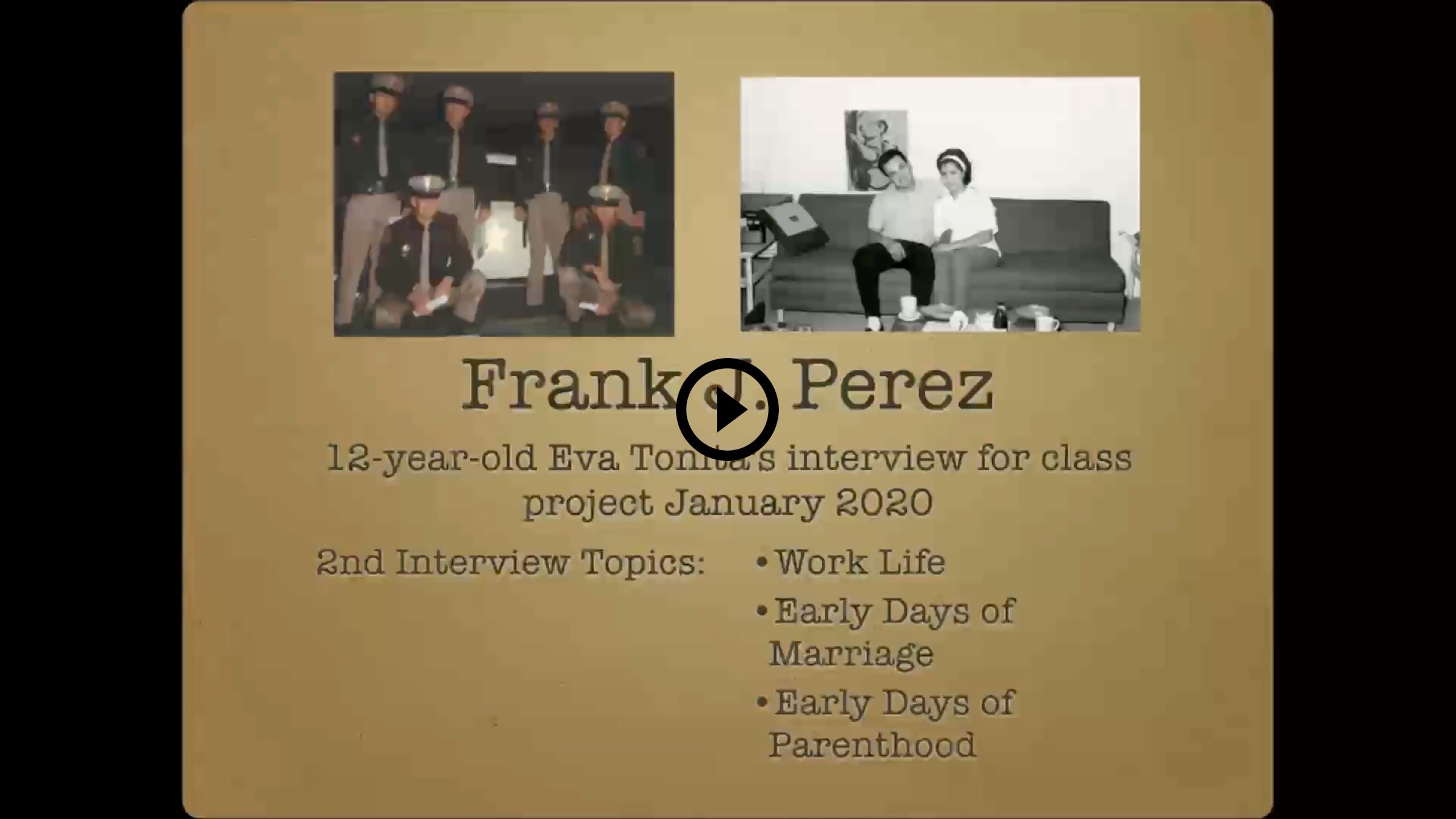 Video interviews with Frank Perez, recorded in January 2020. Interviewed by his 12-year-old granddaughter, Eva Avilez.